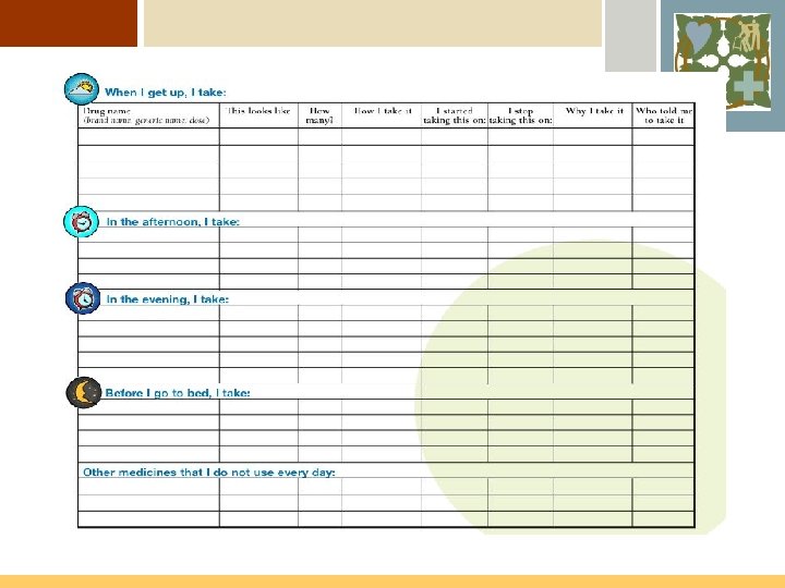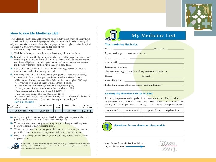 Keep A Medication List Ø Ø Ø Develop your “My Medicine List” You can get started with a simple tool by NTOCC Download the tool from the website Complete the tool with your personal medications Share that information with each clinician you see whether in the ER, hospital, doctor’s office, clinic or pharmacy