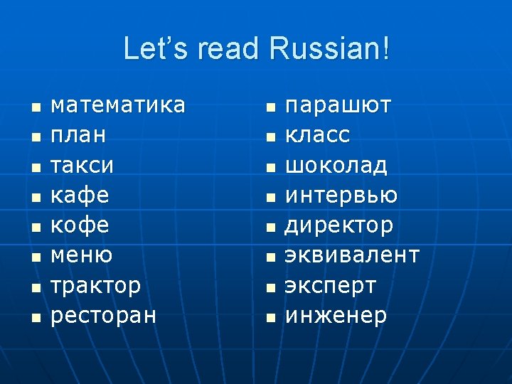 The Russian Alphabet n n A form of Cyrillic – Cyril & Methodius, 10 th century A. D. Largely derived from Greek Generally phonetic Compare with crazy English: • Tough, rough, cough, plough, bough, dough, through n Let’s try it!