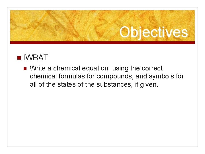 Objectives n IWBAT n Write a chemical equation, using the correct chemical formulas for compounds, and symbols for all of the states of the substances, if given.