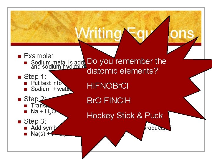 Writing Equations n Example: n n Step 1: n n n diatomic elements? Put text into word equation: HIFNOBr. Cl Sodium + water hydrogen + sodium hydroxide Step 2: n n n Do you remember Sodium metal is added to water. Hydrogen gas the bubbles off, and sodium hydroxide is left behind, in solution. Br. O FINCl. H Translate words in word equation to formulas Na + H 2 O H 2 + Na. OH Step 3: n n Hockey Stick & Puck Add symbols to tell states of reactants and products. Na(s) + H 2 O(l) H 2(g) + Na. OH(aq)
