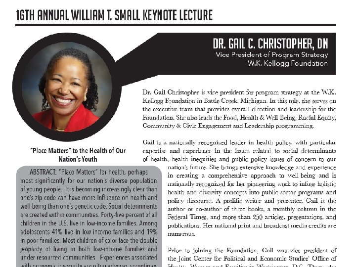 THE 16 TH ANNUAL WILLIAM T. SMALL JR. KEYNOTE LECTURE DR. GAIL C. CHRISTOPHER, DN Keynote speaker Friday February 28, 2014 2: 00 pm – 3: 30 pm EST Register online: http: //minorityhealth. web. unc. edu/confer ence/keynote-webcast/