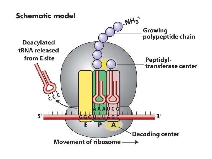 Initiation • A site (aminoacyl) is where incoming aminoacyl-t. RNA, carrying the next amino acid to be added to the polypeptide chain, binds to the m. RNA • P site (peptidyl) is where the t. RNA , carrying the growing polypeptide chain is bound • The E site (exit) is where an exiting t. RNA leaves the ribosome.