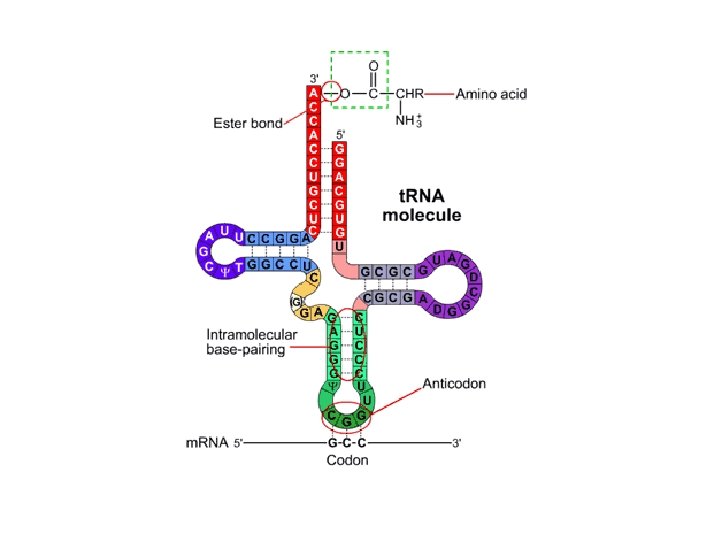 Structure of t. RNA • Folded RNA molecule with an anticodon loop – the anticodon contains a nucleotide triplet which is complementary to the m. RNA codon • Each t. RNA carries a particular amino acid corresponding to its anticodon • The process of adding an amino acid to a t. RNA is called aminoacylation