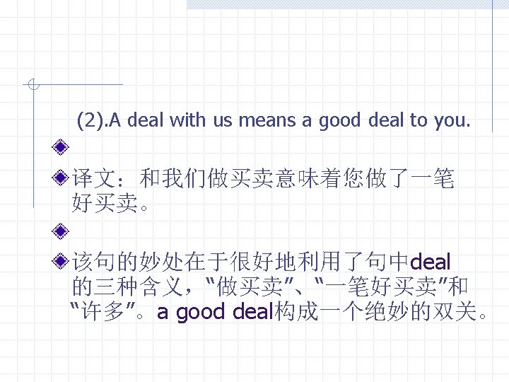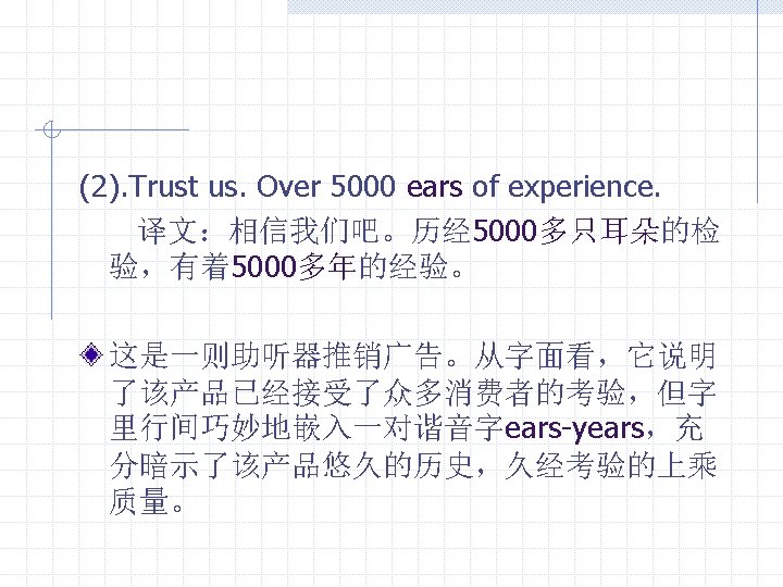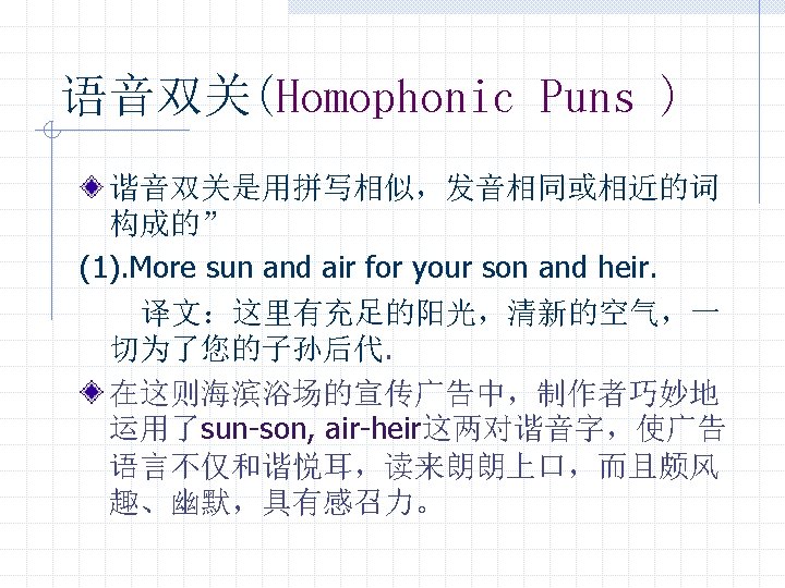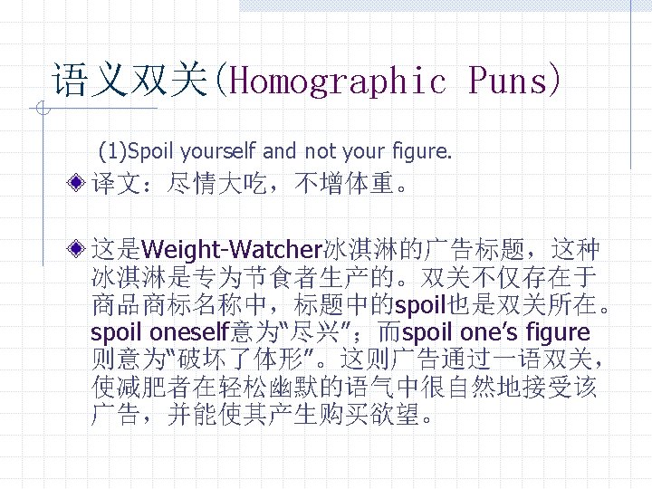 Puns 语音双关(Homophonic Puns ); 语义双关(Homographic Puns); 语法双关(Grammatical Puns); 成语、俗语双关(Idiom Puns) 。