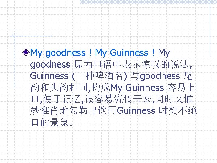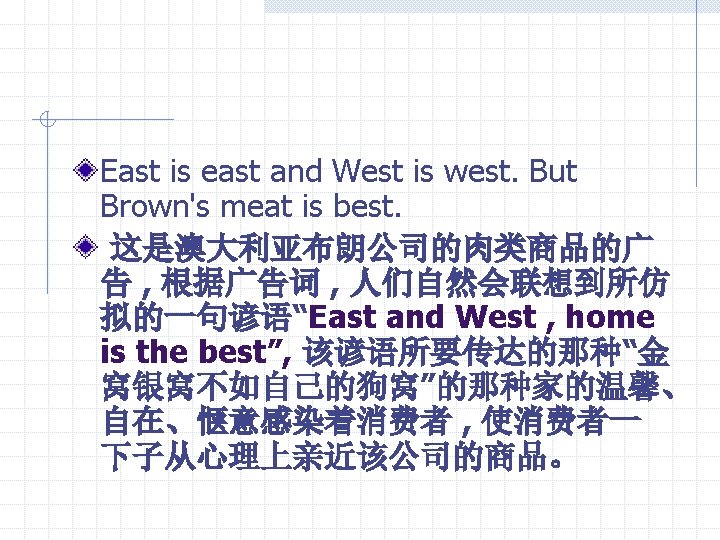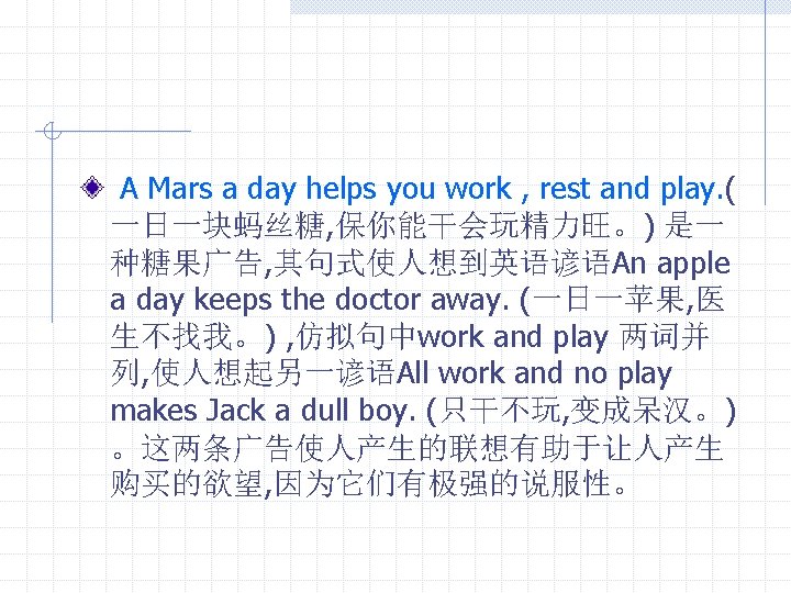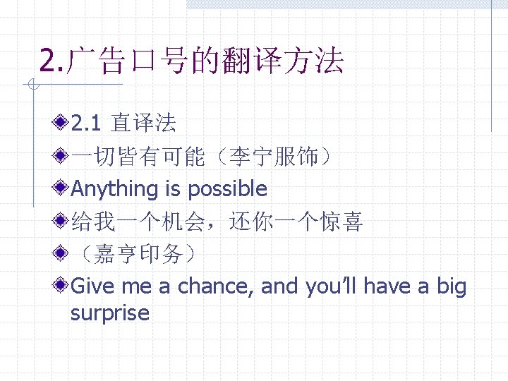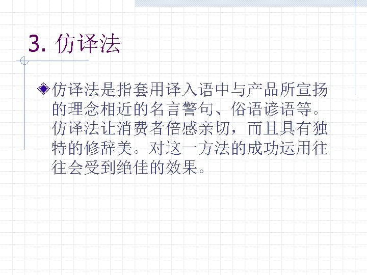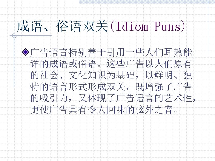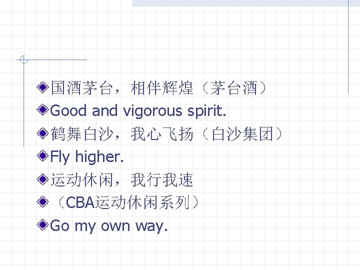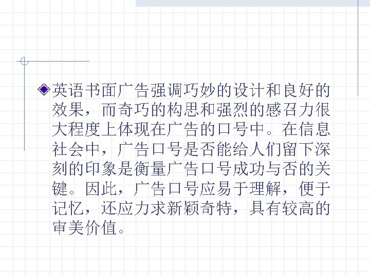 1. The Characteristics of Ads slogans Some examples: A diamond is forever (戴比尔斯钻石公司) Just do it! (Nike) Good to the last drop!(麦氏咖啡) Let’s make things better (菲利浦电器) 国酒茅台,相伴辉煌 大红鹰,胜利之鹰
