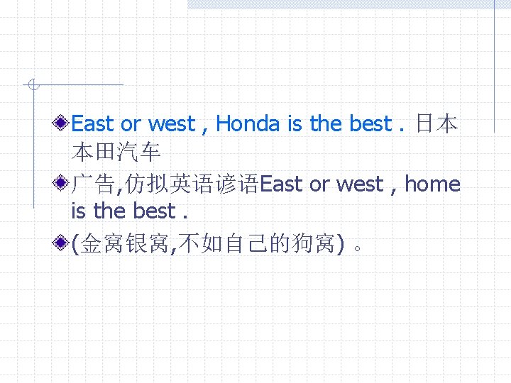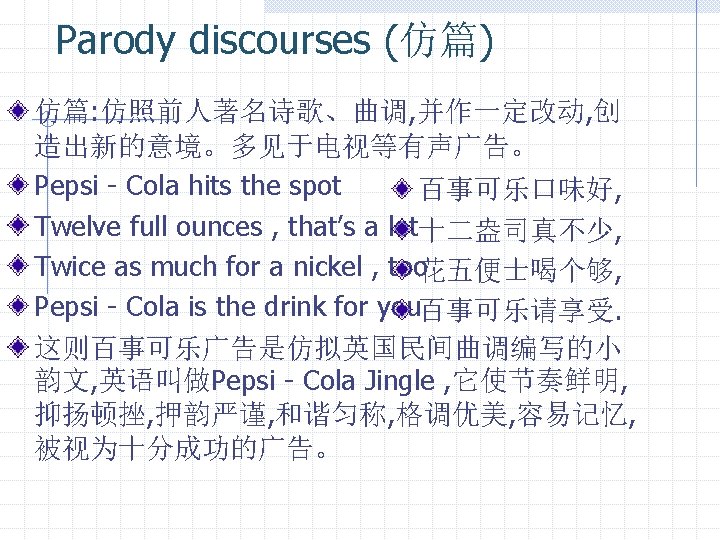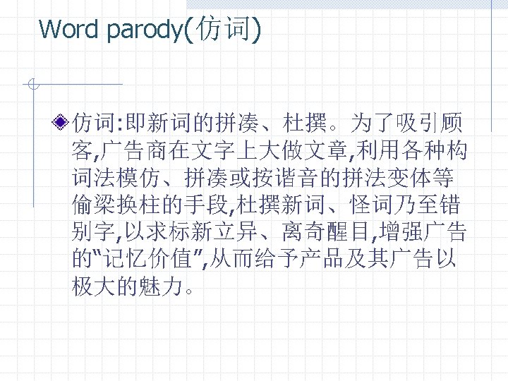 Conclusion There abundant advertisements in the commodity society and parody is one of the most common rhetorical devices used in both English and Chinese advertisements. Generally speaking, parody in advertising English is deemed to embody such rhetorical features as eye-catching, flexible, vivid and short-lived.