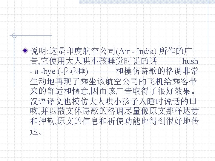Hush - byebaby , up in the sky You’re in Air - India - do you know why , ’Cos it’s the comfiest , scrumptiousest way To travel to Sydney , Bankok - Bombay. 乖乖睡, 小宝贝, 升上蓝 天你尽情睡, 你可知道为何身在印航 不觉累, 因为它能让你旅途最为 舒适最愉快。 直送你到悉尼、曼谷和 孟买。
