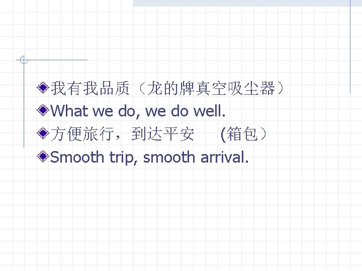 拥有完美肌肤的秘诀 (丁家宜化妆品) The secret for perfect skin 让世界遍布“声佳”电器 Our Aim: Make a global hit—Shengjia Auto Electric.
