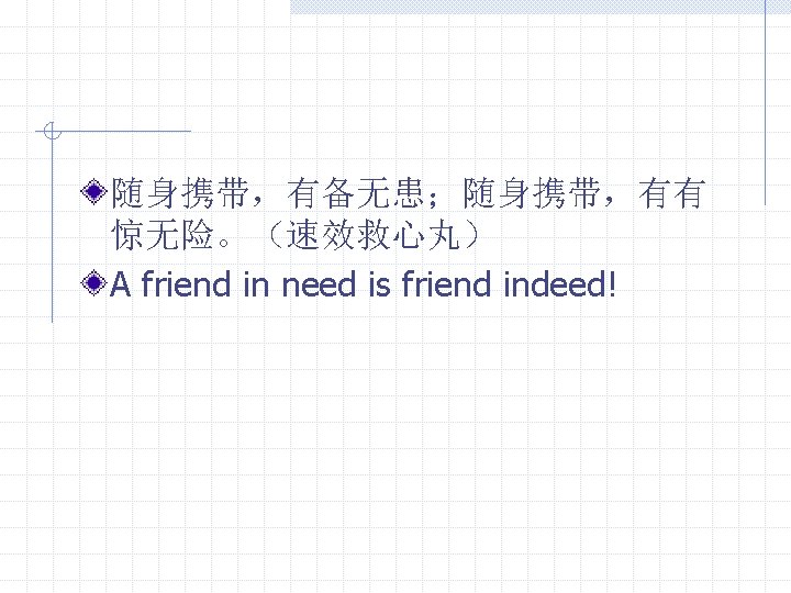 快治人口 Kill, cure, cheer!(夏青) You will say “yeah” if you take it as quickly as possible. (范珊珊) A bit. . a day, keeps cough away. Enjoy great popularity. (周瑜) Quick cure. (唐薇) Use it, you can eat everything. (吴尘)