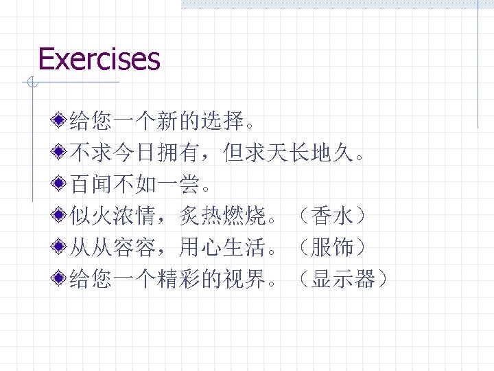 爱您一辈子(绿世界化妆品) Love me tender, love me true. 一册在手 纵览全球(《环球》杂志) The Globe brings you the world in a single copy. 中原之行哪里去?郑州亚西亚。 While in Zhengzhou, do as the Zhengzhounese do----Go shopping in the Asian Supermarket.