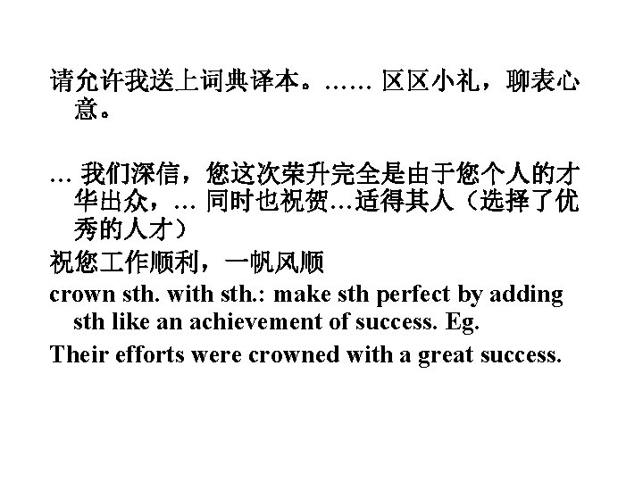 Dear Wang, Allow me to present you a copy of Longman Modern English Dictionary, I know you are studying English now, and hope will find it useful. It’s a trifle gift, but I hope you will accept it as a small token of my gratitude for your continual kindness. Yours truly,