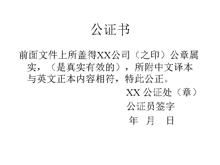 Notarization • This is to notarize that the official seal affixed by the Company to the above document is genuine (&valid) and that the Chinese translation of Document is in conformity with the original copy. Notary_______ Signature_______ XX Notary Office Date______