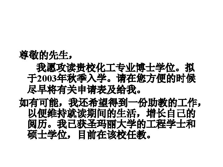 Dear Sirs: I wish to pursue a doctoral degree in Chemical Engineering at your university. My desired date of entrance is fall, 2003. Please send me all necessary application forms at your earliest convenience. If possible, I also wish to obtain a graduate assistantship so that I can support myself and obtain more experience while pursing graduate study. I obtained my B. E. and M. E. from SMU. At present, I work as an instructor at this university.