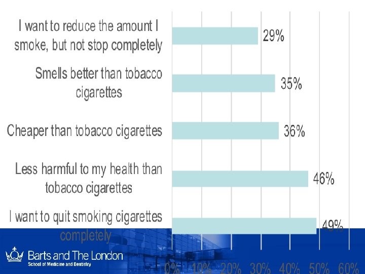 Vaping as a cessation tool • Vaping is a popular quitting tool • Vaping can help some people to quit smoking Cochrane Review “There is evidence from two trials that ECs help smokers to stop smoking in the long term compared with placebo ECs. However, the small number of trials, low event rates and wide confidence intervals around the estimates mean that our confidence in the result is rated ’low’ by GRADE standards. ” Hartmann-Boyce J, Mc. Robbie H, Bullen C, Begh R, Stead LF, Hajek P. Electronic cigarettes for smoking cessation. Cochrane Database of Systematic Reviews 2016,