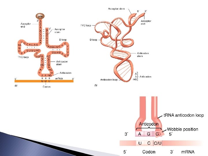 Molecular Components � The structure and function of t. RNA: ◦ Job – to take a specific amino acid to the ribosome, then go pick up another from the cytosol ◦ Looks like a cloverleaf if flattened into a 2 D structure due to the H-bonding between bases ◦ Its 3 D shape is roughly an “L. ” ◦ An enzyme called aminoacyl-t. RNA synthetase attaches a given amino acid to the appropriate t. RNA. There is a different synthetase for each amino acid. ◦ t. RNAs can sometimes match multiple codons because of the third base pair not needing to match exactly (“wobble”)