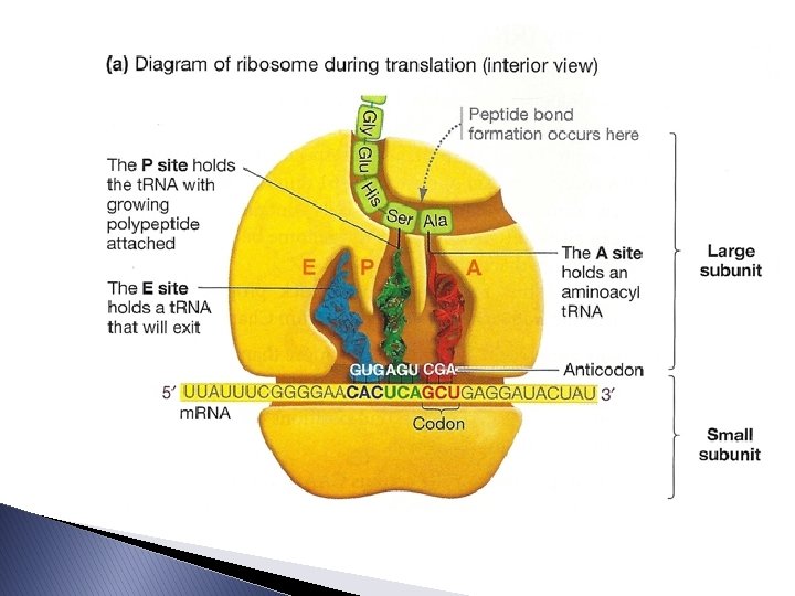 Molecular Components � Ribosomes ◦ Each has 3 binding sites: ◦ P site: (peptidyl-t. RNA site) holds the t. RNA carrying the growing polypeptide chain ◦ A site: (aminoacyl-t. RNA site) holds the t. RNA carrying the next amino acid to be added to the chain ◦ E site: (exit site) where discharged t. RNAs leave the ribosome ◦ The ribosome forms peptide bonds between the amino acids.
