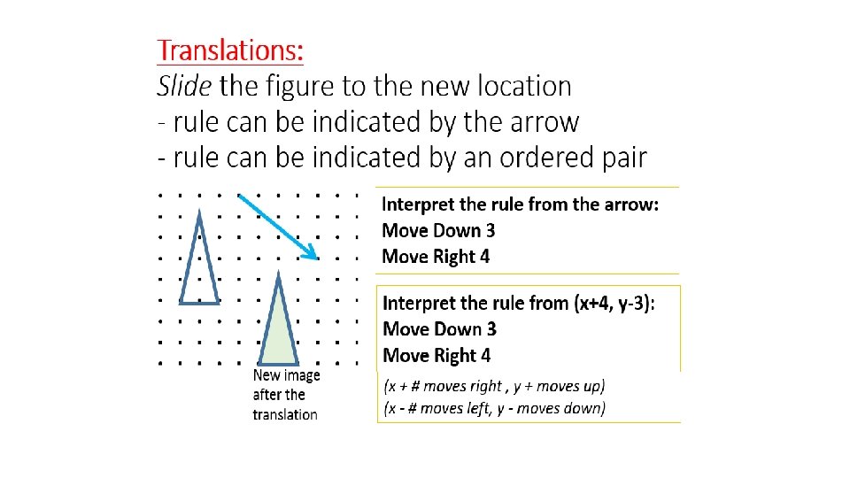 Slide the figure to the new location indicated by the arrow. Interpret the rule from the arrow: Move Down 3 Move Right 4 Move each point of the triangle down 3 and right 4. New image after the translation