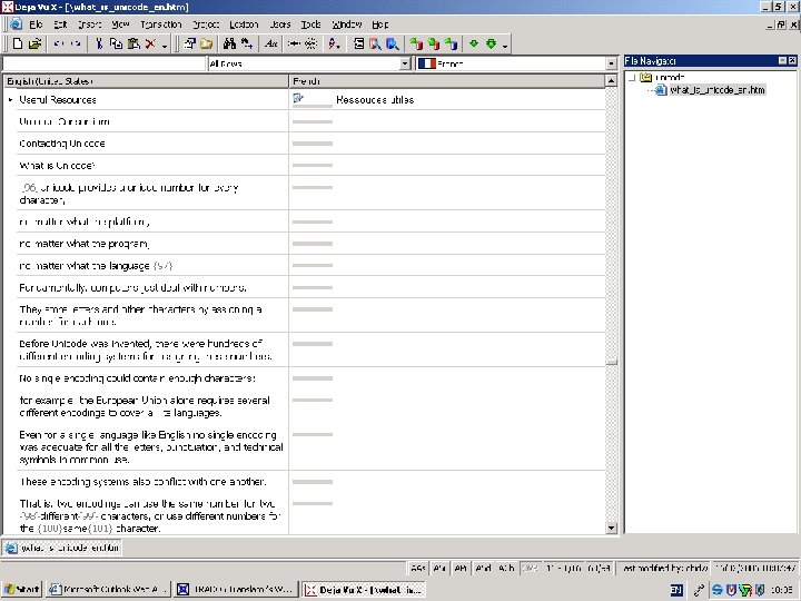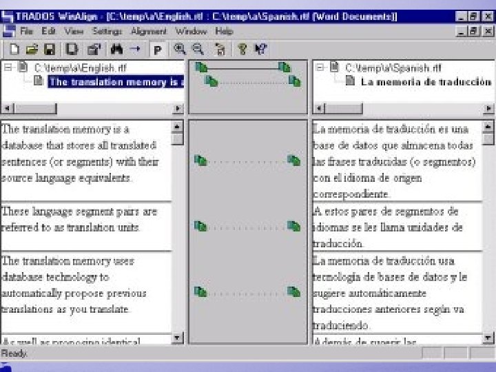 How do translation memory systems work? • A translation memory system splits the pair of texts • • • (original plus translation) into segments. then aligns them as the text is translated sentence by sentence. It is this pair of aligned segments which is often known as a translation unit or TU. Each TU is then stored and indexed in a database or translation memory When the user starts a new translation, whose source text is similar to one already in the database, the system will recognize the similar segments, retrieve them, and suggest them to the user. Any translation memory system is effectively an empty database when first used. The bigger the TM database gets, the more valuable it is.