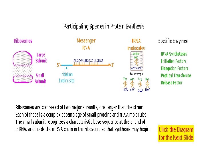 The following diagram is designed as a slide show illustrating these steps. The outcome is synthesis of a polypeptide chain corresponding to the m. RNA blueprint. A "stop codon" at a designated position on the m. RNA terminates the synthesis by introduction of a "Release Factor".