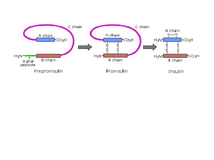 Peptide chains may also be cut in the middle to form shorter strands. Thus, insulin is initially synthesized as a 105 residue preprotein. The 24 amino acid signal peptide is removed, yielding a proinsulin peptide. This folds and forms disulfide bonds between cysteines 7 and 67 and between 19 and 80. Such dimeric cysteines, joined by a disulfide bond, are named cystine. A protease then cleaves the peptide at arg 31 and arg 60, with loss of the 32 -60 sequence (chain C). Removal of arg 31 yields mature insulin, with the A and B chains held together by disulfide bonds and a third cystine moiety in chain A. The following cartoon illustrates this chain of events.