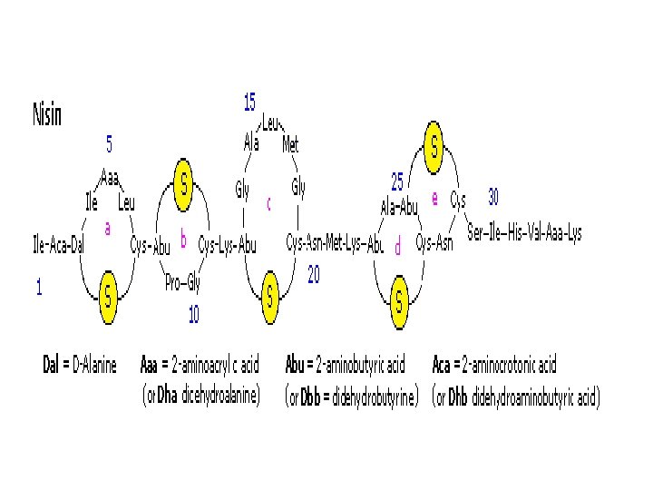 Nisin is a polypeptide (34 amino acids) made by the bacterium Lactococcus lactis. Nisin kills gram positive bacteria by binding to their membranes and targeting lipid II, an essential precursor of cell wall synthesis. Such antimicrobial peptides are a growing family of compounds which have received the name lantibiotics due to the presence of lanthionine, a nonproteinogenic amino acid with the chemical formula HO 2 C-CH(NH 2)-CH 2 -S-CH 2 -CH(NH 2)-CO 2 H. Lanthionine is composed of two alanine residues that are crosslinked on their β-carbon atoms by a thioether linkage (i. e. it is the monosulfide analog of the disulfide cystine). Lantibiotics are unique in that they are ribosomally synthesized as prepeptides, followed by post-translational processing of a number of amino acids (e. g. serine, threonine and cysteine) into dehydro residues and thioether crossbridges. Nisin is the only bacteriocin that is accepted as a food preservative. Several nisin subtypes that differ in amino acid composition and biological activity are known. A typical structure is drawn below, and a Jmol model will be presented by clicking on the diagram.