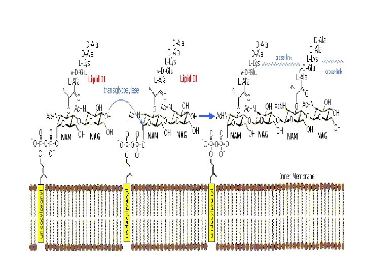 The monomer units are composed of two amino sugars, Nacetylglucosamine (NAG) and N-acetylmuramic acid (NAM), shown on the right. Transglycosidase enzymes join these units by glycoside bonds, and they are further interlinked to each other via peptide cross-links between the pentapeptide moieties that are attached to the NAM residues. Peptidoglycan subunits are assembled on the cytoplasmic side of the bacterial membrane from a polyisoprenoid anchor. Lipid II, a membrane-anchored cell-wall precursor that is essential for bacterial cell-wall biosynthesis, is one of the key components in the synthesis of peptidoglycan. Peptidoglycan synthesis via polymerization of Lipid II is illustrated in the following diagram Cross-linking of the peptide side chains is then effected by transpeptidase enzymes. A model of Lipid II complexed with nisin may be examined as part of the previous Jmol display.