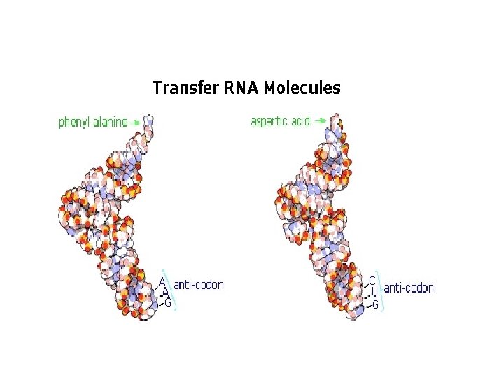 The translation process is fundamentally straightforward. The m. RNA strand bearing the transcribed code for synthesis of a protein interacts with relatively small RNA molecules (about 70 nucleotides) to which individual amino acids have been attached by an ester bond at the 3'-end. These transfer RNA's (t. RNA) have distinctive threedimensional structures consisting of loops of single-stranded RNA connected by double stranded segments. This cloverleaf secondary structure is further wrapped into an "L-shaped" assembly, having the amino acid at the end of one arm, and a characteristic anti-codon region at the other end. The anticodon consists of a nucleotide triplet that is the complement of the amino acid's codon(s). Models of two such t. RNA molecules are shown to the right. When read from the top to the bottom, the anti-codons depicted here should complement a codon in the previous table