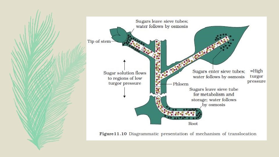 – Glucose prepared at the source by photosynthesis is converted to sucrose. – Sucrose moves into the companion cell and then into sieve tube cell by active transport. – The process of loading at the source produces a hypertonic condition in the phloem. – Water in the adjacent xylem moves into the phloem by osmosis. – Osmotic pressure builds up in the phloem, leading to movement of sap to areas of lower pressure. – At the sink, osmotic pressure is low. Active transport helps to move the sucrose out of the phloem into the cells. – The osmotic pressure decreases and water moves out of the phloem into the adjacent xylem. – The mass movement in the phloem is based on the water potential gradient.
