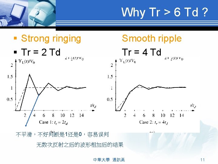 Why Tr > 6 Td ? § Multi-reflections occurred at load § Tr = 2 Td Tr = 4 Td 中華大學 通訊系 10
