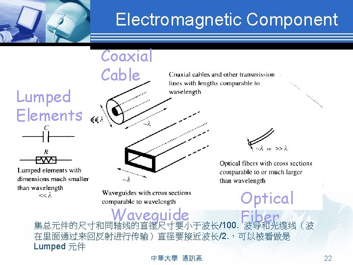 Component size v. s. Wavelength § Definitions of lumped element § (1) Input current amplitude = Output current amplitude § (2) Input current phase = Output current phase § Only at 100 MHz, 2 cm resistor can be treated as a lumped resistor ! 中華大學 通訊系 21