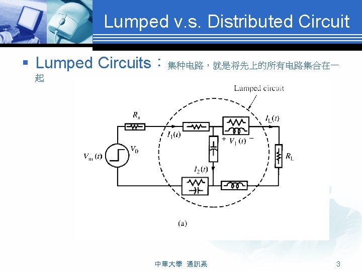 Lumped v. s. Distributed Circuit § Definitions of lumped element(RLC) § 定义:流入流出的电流和相位一样,没有差值 § (1) Input current amplitude () = Output current amplitude § (2) Input current phase = Output current phase 中華大學 通訊系 4