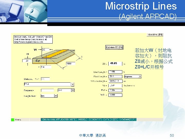 Skin Effect § For low frequency s A § For high frequency Skin depth d s d 高频时,频率越高,截面积越小,阻抗越大 中華大學 通訊系 49