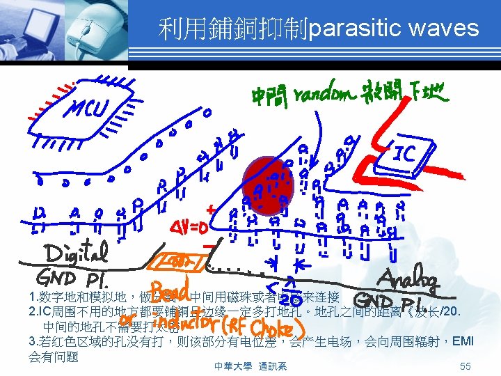 Example of Radio-Frequency Interconnection § § For 1 GHz RF signal in PCB circuits Vp= 0. 6 c =180 mm/ns = Vp/freq =180 mm Rule of Thumb only worked as: Td < T/100 = 0. 01 ns L < /100 = 1. 8 mm = 71 mil § Distributed analysis is needed for RF PCB design !! 中華大學 通訊系 19