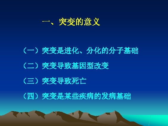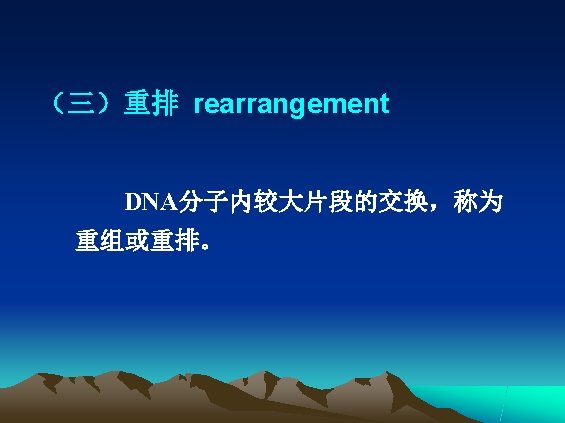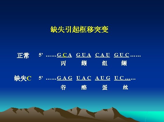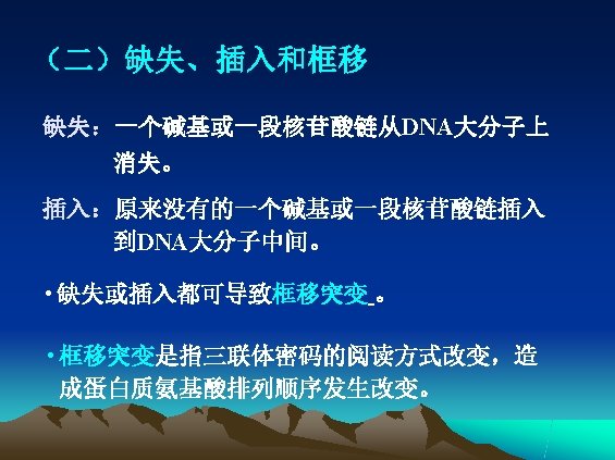 三、突变的分子改变类型 • 错配 (mismatch) • 缺失 (deletion) • 插入 (insertion) 框移 (frame-shift) • 重排 (rearrangement)