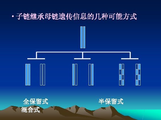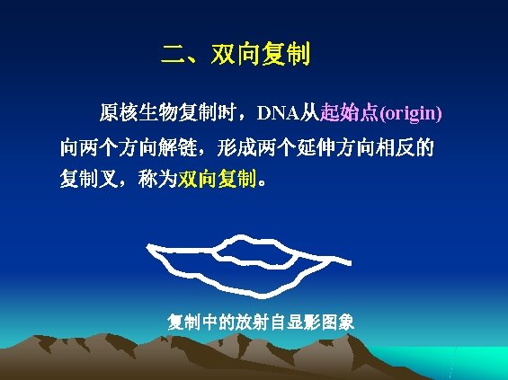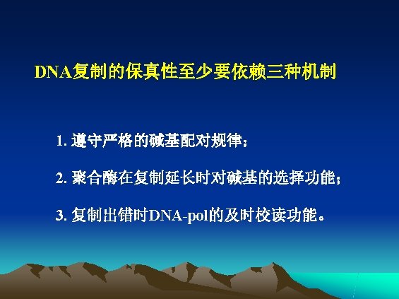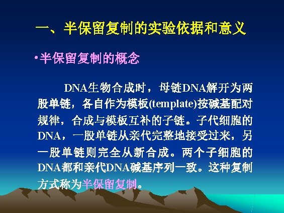 l 复制的方式 ——半保留复制(semi-conservative replication) l 复制的高保真性(high fidelity) l 双向复制(bidirectional replication) l 半不连续复制(semi-discontinuous replication)