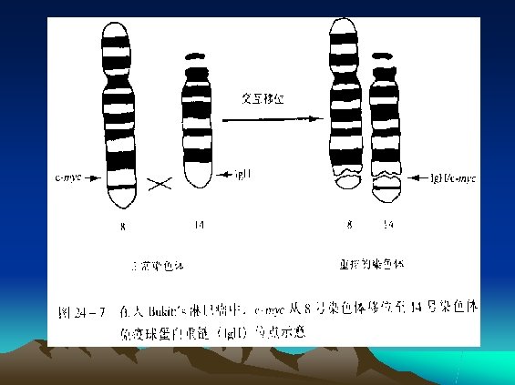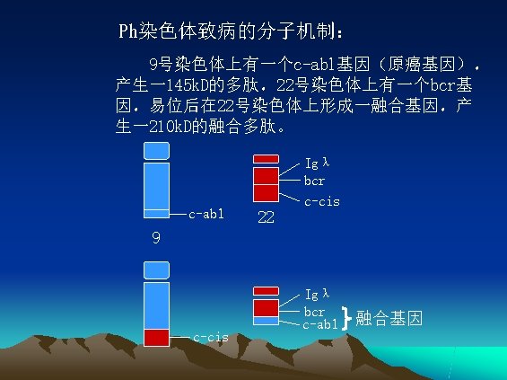 C-abl基因(280 kb)(145 k. D蛋白) 9 q 1 b 1 a 2 3 4 4 5 6 7 8 9 10 11 22 q 1 2 3 7 8 9 10 14 C-bcr基因(130 kb) 2 -11 1 -11 210 k. D蛋白 15 19 20