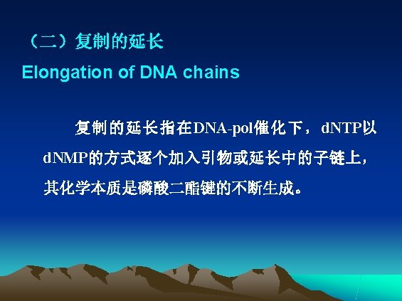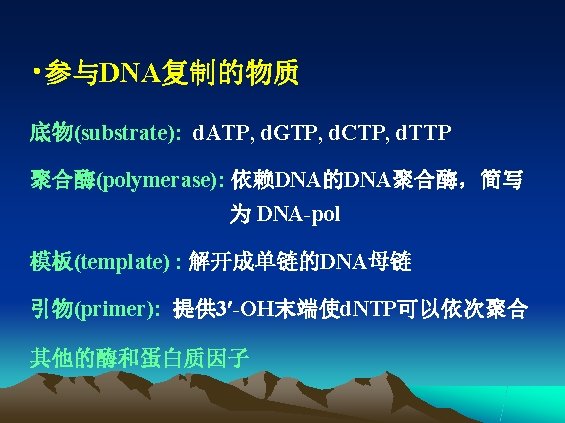 • 聚合反应的特点 DNA 新链生成需引物和模板; 新链的延长只可沿 5 → 3 方向进行 。 DNA polymerases require both templates and primer. DNA polymerases polymerize nucleotides in the 5’ to 3’ direction.