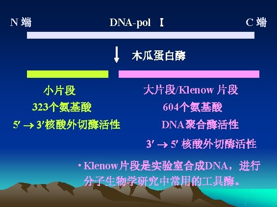 五、DNA连接酶 DNA ligase • DNA连接酶作用方式 连接DNA链 3 -OH末端和相邻DNA链 5 -P 末端,使二者生成磷酸二酯键,从而把两段相 邻的DNA链连接成一条完整的链。 This enzyme catalyzes the formation of phosphodiester bonds between the 3’hydroxy group at the end of one DNA chain and 5’phosphate group at the end of the other.