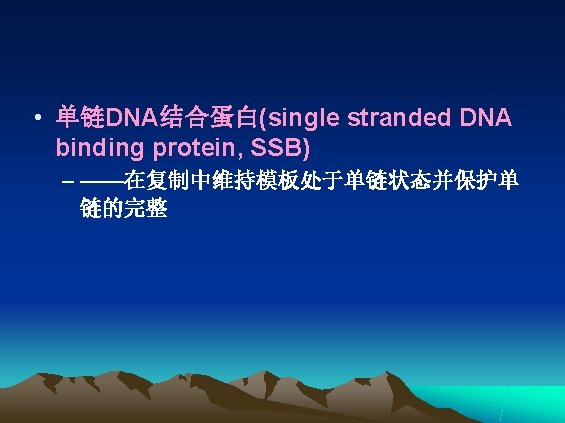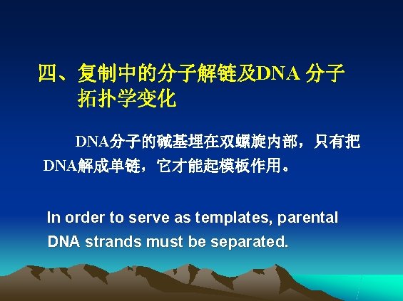 • 解螺旋酶(helicase) ——利用ATP供能,作用于氢键,使DNA双链 解开成为两条单链 • To separate the parental DNA at physiological temperatures, cells use enzymes call helicase. Helicase binds to single-stranded DNA and moves along it in a fixed direction, with each step requiring hydrolysis of ATP.