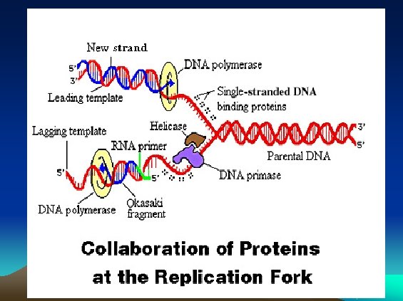 Each replication fork has a leading and a lagging strand leading strand (synthesized continuously) replication fork 5’ 3’ 3’ 5’ lagging strand (synthesized discontinuously) • The leading and lagging strand arrows show the direction of DNA chain elongation in a 5’ to 3’ direction • The small DNA pieces on the lagging strand are called Okazaki fragments (100 -1000 bases in length)