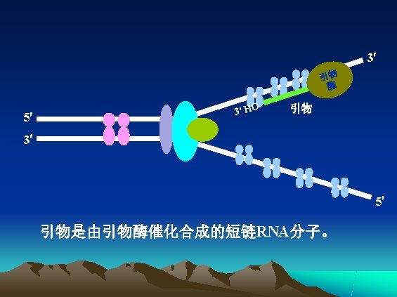 • 引物酶(primase) – ——复制起始时催化生成RNA引物的酶 – DNA polymerases require primers that provide a free 3’-OH to which the deoxyribonucleotide can be added covalently. The primers are short of RNA. Synthesized by a special enzyme called a primase.