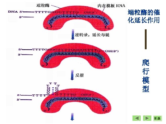 • 端粒酶(telomerase) 组成 • 端粒酶RNA (human telomerase RNA, h. TR) • 端粒酶协同蛋白(human telomerase associated protein 1, h. TP 1) • 端粒酶逆转录酶(human telomerase reverse transcriptase, h. TRT)