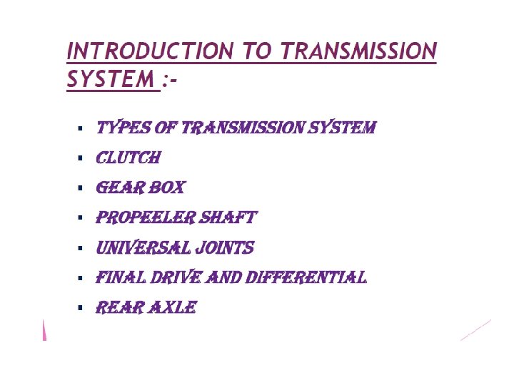 Requirement of Transmission System • To provide for disconnecting the engine from the driving wheels • When engine is running , connect the driving wheels to engine smoothly without shock • Leverage between engine and driving wheels to be varied • Enable the driving wheels to rotate at different speeds. • Provide relative movement between engine and driving wheels