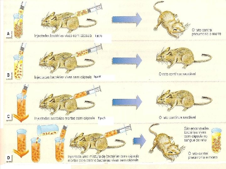 Observações de Griffith (1928) Griffith trabalhou com bactérias causadoras de pneumonia – Streptococcus pneumoniae. Observando-as ao microscópio, verificou que existiam duas estirpes: bactérias tipo S e bactérias tipo R. As suas investigações tinham como principal objectivo, desenvolver uma vacina contra a pneumonia.
