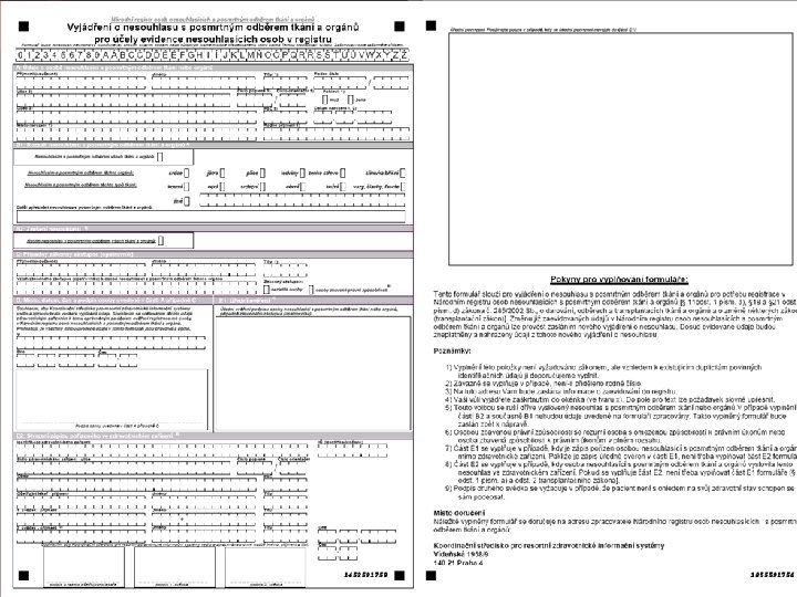 Vyjádření nesouhlasu s posmrtným odběrem orgánů a tkání n Nesouhlas s posmrtným odběrem tkání a orgánů je možno vyjádřit: a) ve zdravotnickém zařízení, kdy je vyjádření nesouhlasu stvrzeno podpisem pacienta, ošetřujícího lékaře a svědka. Pokud se pacient s ohledem na svůj zdravotní stav nemůže sám podepsat, potvrdí projev jeho vůle ještě další svědek. Pokud se jedná o nezletilou osobu, nebo osobu zbavenou způsobilosti, podepíše zápis její zákonný zástupce a ošetřující lékař. - Originál zápisu se ukládá do zdravotnické dokumentace pacienta. Kopie zápisu se zasílá nejpozději do 3 dnů od jejího sepsání na adresu Koordinačního střediska pro resortní zdravotnické informační systémy ke zpracování a zaevidování do Národního registru osob nesouhlasících s posmrtným odběrem tkání a orgánů.