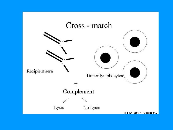 Cross-match test ● průkaz preformovaných protilátek ● sérum příjemce + lymfocyty dárce + králičí komplement → jsou-li v séru příjemce cytotoxické Ab proti dárcovským HLA Ag (tzv. aloprotilátky = Ab aktivující komplement) → lýza dárcových lymfocytů. Vizualizace průnikem barviva do lyzovaných bb. ● pozitivita testu = přítomnost preformovaných Ab → riziko hyperakutní rejekce! → kontraindikace transplantace
