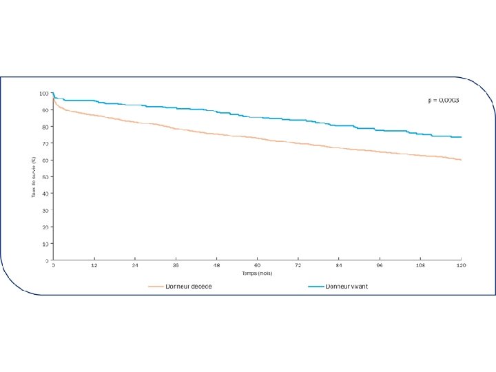 Survie du greffon Année de greffe Effectif Survie à 1 mois Survie à 1 an Survie à 5 ans Survie à 10 ans Survie à 15 ans Médianede survie en mois 19851995 1561 91% 82. 5 % 67. 3% 56. 2% 42% 147. 7 (89. 5 – 92. 4) (80. 5 – 84. 3) (64. 9 – 69. 6) (53. 7 – 58. 7) (39. 4 – 44. 6) (138; 5 – 159. 1) 19962007 1324 96. 2% 93. 3% 82. 5 % 67. 4 % (95 – 97. 1) (91. 8 – 94. 5) (80. 1 – 84. 6) (63. 5 – 70. 9)