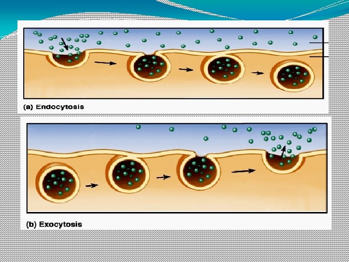 Endocytosis � Endocytosis: (“Endo” means “in”). � Endocytosis is the taking in of molecules or particles by invagination of the cell membrane forming a vesicle. Integrity of plasma membrane is maintained. � This requires energy. � Endocytosis is fallowed by exocytosis on the other side. – Transcytosis, vesicle trafficking, or cytopempsis.