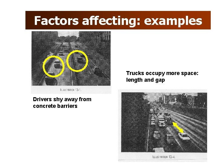 Factors affecting: examples Trucks occupy more space: length and gap Drivers shy away from concrete barriers 13