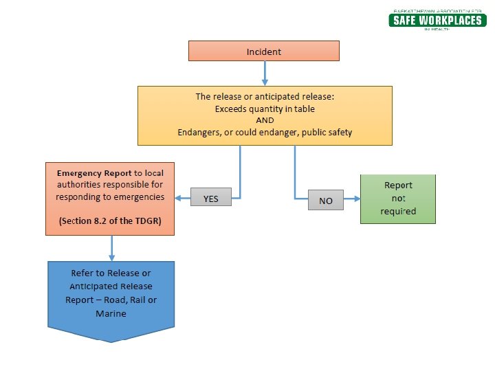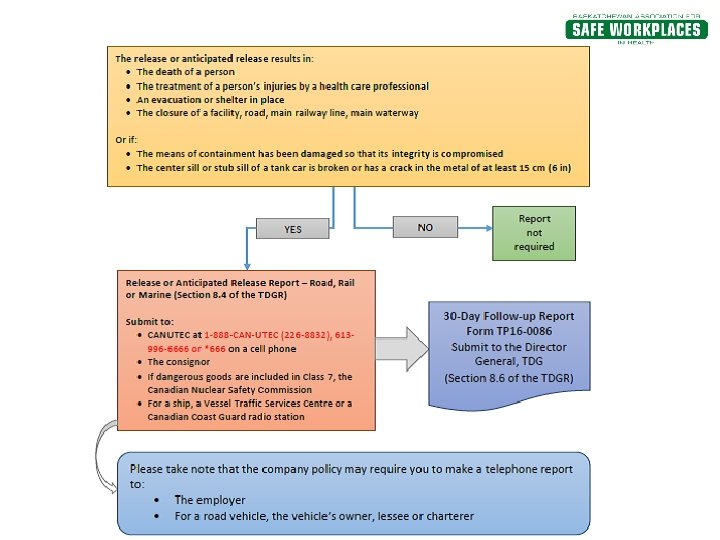 Reporting A release (or imminent release) of any amount of Class 6. 2 material is immediately reportable by whomever has possession of the dangerous goods at the time of the release. The incident must be reported to all of the following: § Provincial authorities (Saskatchewan 1 -800 -667 -7525) or local police § The employer § The consignor § The owner of the road vehicle, if applicable § CANUTEC if transporting by ground, rail, ship or air.
